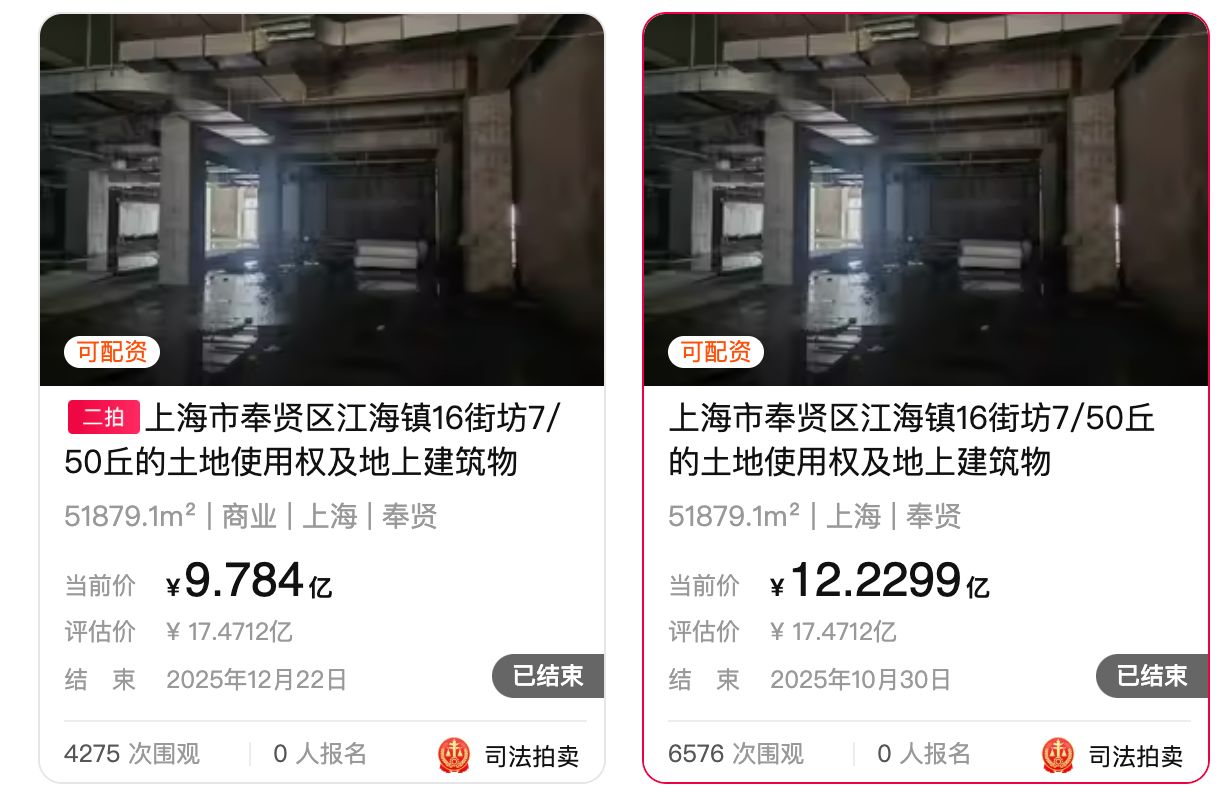 12月19日,奉贤富力万达广场第二次挂牌拍卖,起拍价9.784亿元,相较于资产评估价17.471亿元打了五六折。相比之下,该项目今年10月30日首次挂牌时价格为12.23亿元。