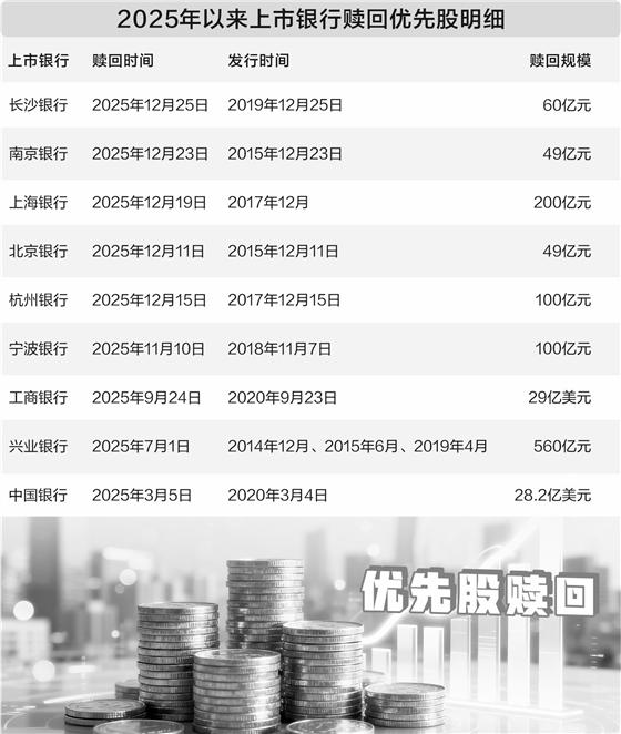 证券时报记者注意到,12月以来,包括长沙银行在内,已有北京银行、上海银行、杭州银行和南京银行等5家银行先后宣布对旗下优先股进行赎回,合计规模达458亿元。若加上此前的工商银行、中国银行、兴业银行和宁波银行,2025年以来赎回优先股的银行数量已增加至9家。