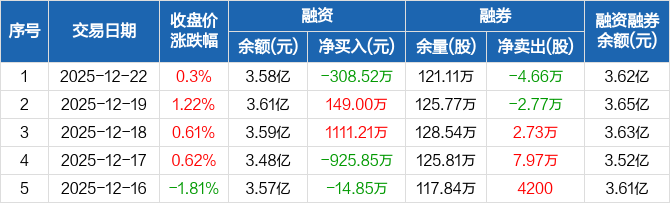 融资方面,当日融资买入729.9万元,融资偿还1038.42万元,融资净偿还308.52万元。融券方面,融券卖出8900股,融券偿还5.55万股,融券余量121.11万股,融券余额404.51万元。融资融券余额合计3.62亿元。