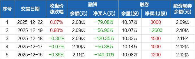 融资方面,当日融资买入215.59万元,融资偿还294.67万元,融资净偿还79.08万元,连续5日净偿还累计461.79万元。融券方面,融券卖出3100股,融券偿还100股,融券余量10.37万股,融券余额146.84万元。融资融券余额合计2.09亿元。
