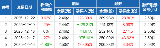 融资方面,当日融资买入2197.31万元,融资偿还2074.01万元,融资净买入123.3万元。融券方面,融券卖出32.21万股,融券偿还3.41万股,融券余量289.93万股,融券余额472.59万元。融资融券余额合计2.5亿元。