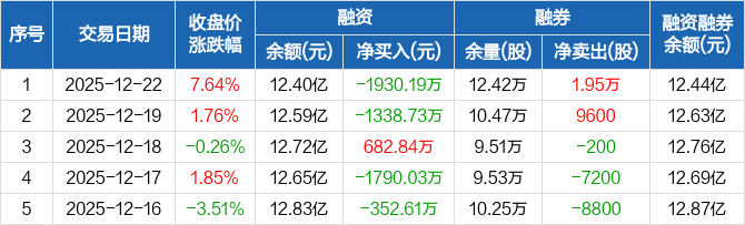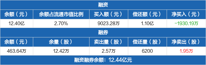 融资方面,当日融资买入9023.28万元,融资偿还1.1亿元,融资净偿还1930.19万元。融券方面,融券卖出2.57万股,融券偿还6200股,融券余量12.42万股,融券余额463.64万元。融资融券余额合计12.44亿元。