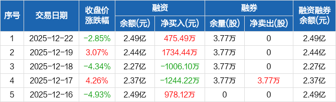 融资方面,当日融资买入4781.4万元,融资偿还4305.91万元,融资净买入475.49万元。融券方面,融券卖出0股,融券偿还0股,融券余量3.77万股,融券余额28.31万元。融资融券余额合计2.49亿元。