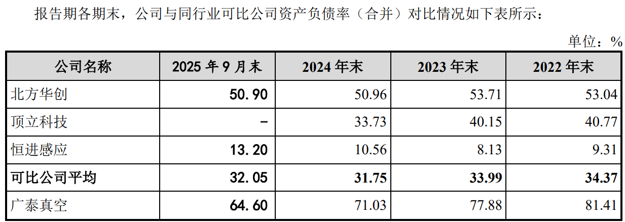 近年来公司资产负债率虽然持续下降,至2025年三季度末为64.6%,但仍处高位,并且远高于同行可比公司平均值,同行均值为32.05%,偿债风险整体较高,公司称主要原因为合同负债金额较高。报告期各期末(2022年至2024年及2025年前三季度),公司合同负债余额分别为3.19亿元、4.52亿元、4.86亿元及4.46亿元,占总负债的比重分别为58.74%、72.63%、79.76%及74.62%。
