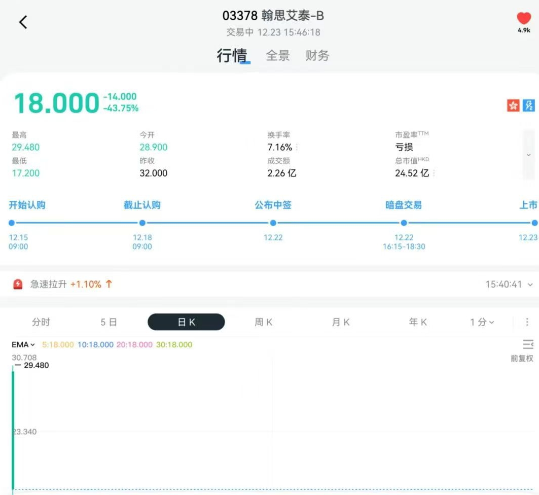 继12月22日华芢生物-B打新遭遇重挫后,12月23日翰思艾泰-B上市首日再度大幅破发,连续两只新股的低迷表现,上演接连大面(股票投资中的一个通俗说法,用来形容投资者在打新后,新股上市首日股价就跌破发行价,导致中签者出现较大幅度亏损的情况),让此前热度高涨的生物科技打新情绪迅速降温。
