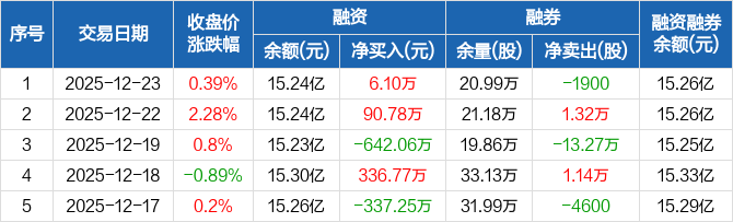 融资方面,当日融资买入1252.49万元,融资偿还1246.39万元,融资净买入6.1万元。融券方面,融券卖出6500股,融券偿还8400股,融券余量20.99万股,融券余额217.04万元。融资融券余额合计15.26亿元。