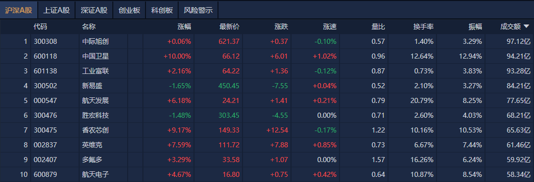 个股方面,中际旭创成交额超97亿元居首,中国卫星、工业富联、新易盛成交额靠前。