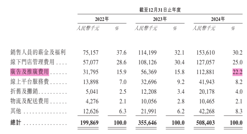 从销售费用的构成看,其中,“广告及推广费用”的增速最快,占销售费用的比例也从2022年的15.9%一路攀升至22.2%。