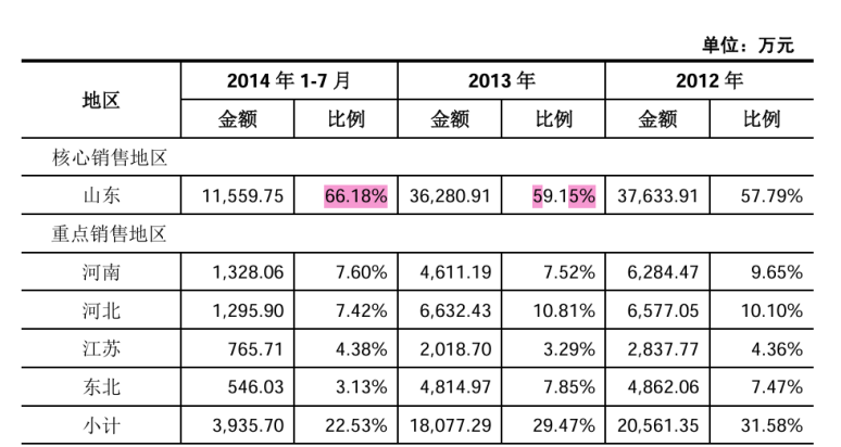 坦博尔于2015年向新三板提交的《公开转让说明书》显示,2012年-2014年7月份,来自山东大本营的收入分别占到公司总收入的58%、59%与66%。如果算上河北、河南以及东北的份额,仅北方市场就为坦博尔贡献了超85%的收入。