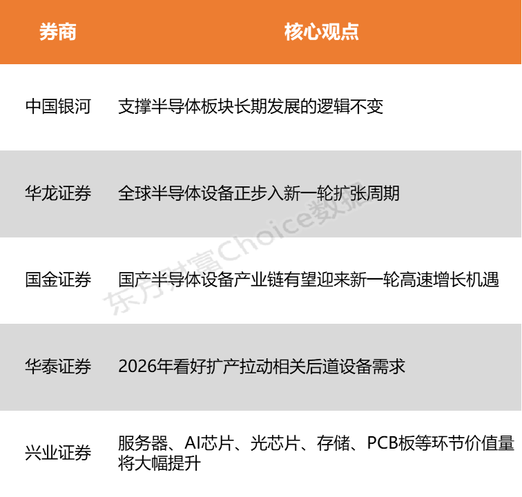 中国银河证券表示,半导体行业在AI浪潮、国产替代、技术创新等多重因素的驱动下,整体表现相对较好,支撑半导体板块长期发展的逻辑不变。华龙证券指出,全球半导体设备正步入新一轮扩张周期,半导体设备景气度与国产化率有望同步上行。