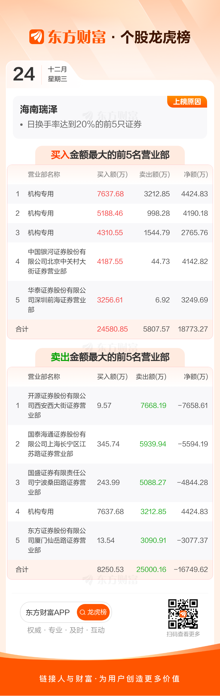 交易所2025年12月24日公布的交易公开信息显示,海南瑞泽因成为日换手率达到20%的前5只证券上榜。海南瑞泽当日收报6.22元,涨跌幅-4.01%,偏离值34.79%,换手率34.79%,成交额25.43亿。