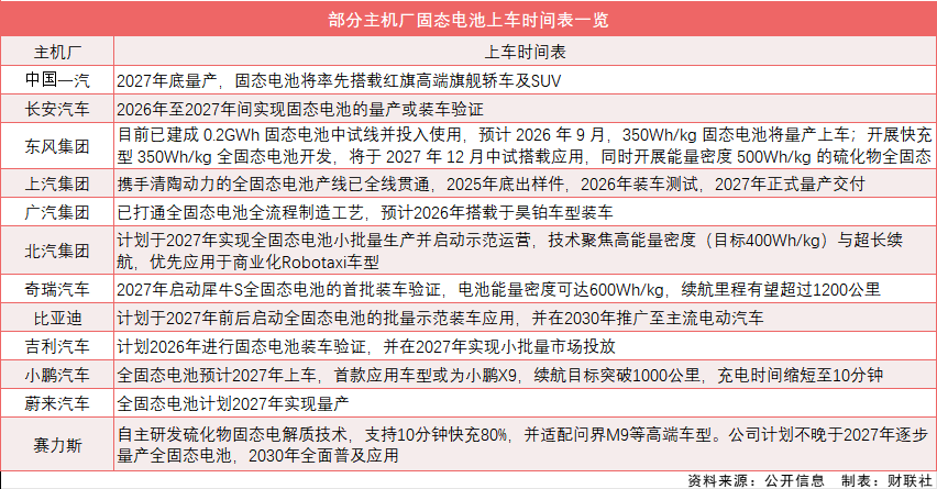 据财联社记者初步统计,截至目前,已有包括三大央企及比亚迪、吉利等在内的12家主流整车制造商于2025年披露了各自固态电池的上车进度,均指向2026年装车验证、2027年初步量产这一时间节点。