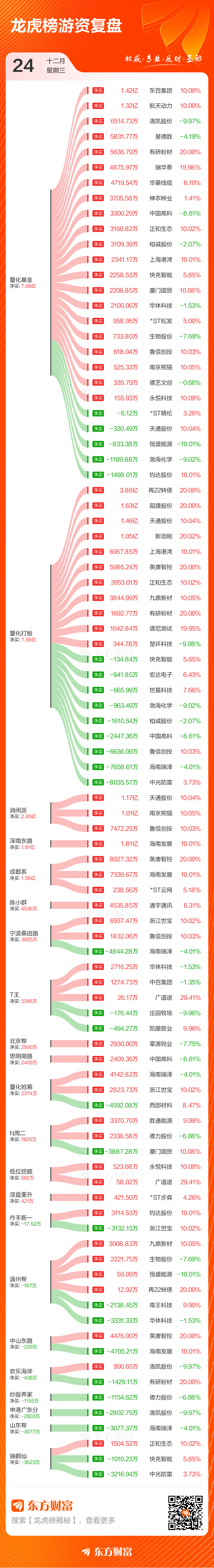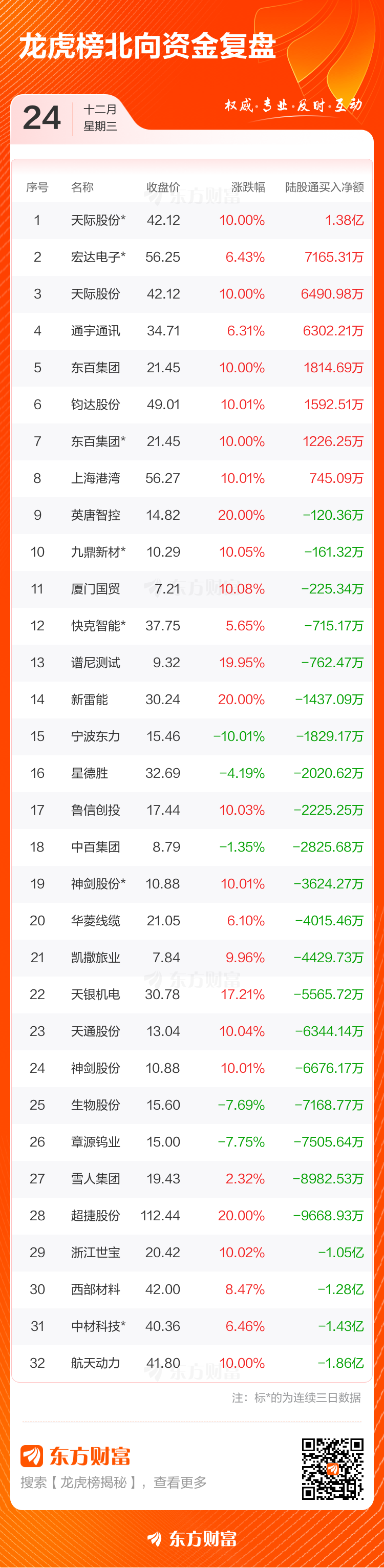 12月24日共有67只个股(含1只可转债)上榜龙虎榜,总上榜成交额240.53亿元。上榜个股中净买入额最高的是天银机电,金额为3.44亿元。