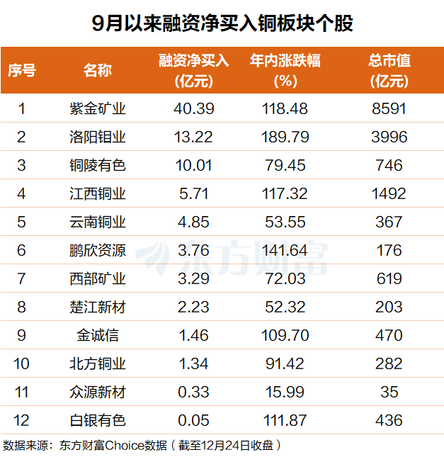 铜陵有色、江西铜业、云南铜业、鹏欣资源、西部矿业、楚江新材、金诚信、北方铜业等个股融资净买额在10亿元至1亿元之间不等。
