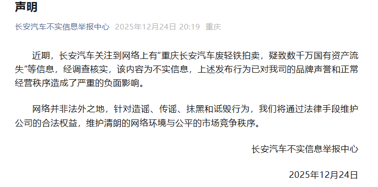 12月24日,长安汽车不实信息举报中心发布声明称,近期,长安汽车关注到网络上有“重庆长安汽车废轻铁拍卖,疑致数千万国有资产流失”等信息,经调查核实,该内容为不实信息,上述发布行为已对公司的品牌声誉和正常经营秩序造成了严重的负面影响。