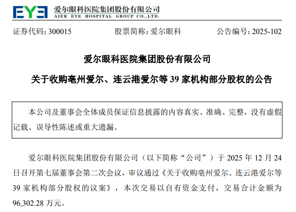 12月24日晚间,爱尔眼科 (300015)公告称,公司第七届董事会第二次会议审议通过《关于收购亳州爱尔、连云港爱尔等39家机构部分股权的议案》,本次交易以自有资金支付,交易合计金额为9.63亿元。 本次交易不构成关联交易,不构成重大资产重组。本次交易未达到股东会议事范围,经公司董事会审议批准后即可实施。