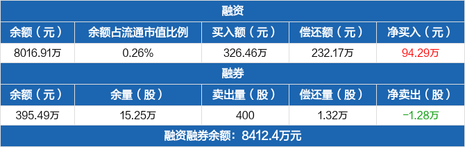 融资方面,当日融资买入326.46万元,融资偿还232.17万元,融资净买入94.29万元,连续3日净买入累计917.3万元。融券方面,融券卖出400股,融券偿还1.32万股,融券余量15.25万股,融券余额395.49万元。融资融券余额合计8412.4万元。