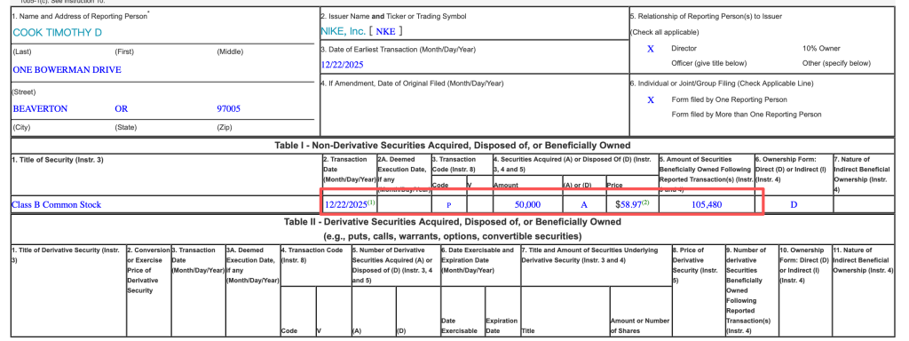 耐克业绩低迷之际,获得董事库克5万股增持。