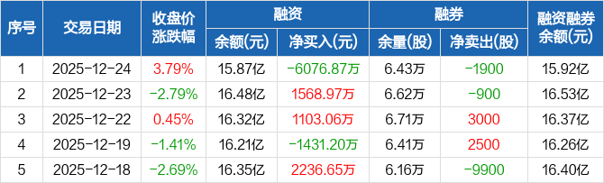 融资方面,当日融资买入9450.84万元,融资偿还1.55亿元,融资净偿还6076.87万元。融券方面,融券卖出3000股,融券偿还4900股,融券余量6.43万股,融券余额492.54万元。融资融券余额合计15.92亿元。
