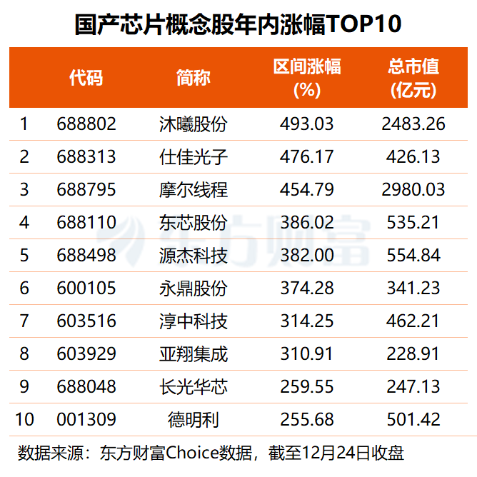 国产芯片板块年内走势较好,近八成概念股股价上涨,平均涨幅约48%,其中53股年内股价已翻倍。除了新近上市的摩尔线程、沐曦股份,仕佳光子年内涨幅居前,达476.17%,东芯股份、源杰科技、永鼎股份、淳中科技、亚翔集成5股区间涨幅均超3倍。