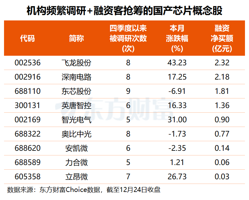 值得注意的是,上述19只机构高度关注的国产芯片概念股中,共有4股本月获得融资客超1亿元加仓,分别是飞龙股份、深南电路、东芯股份和英唐智控,融资净买额分别为2.32亿、2.18亿、1.81亿和1.36亿元。