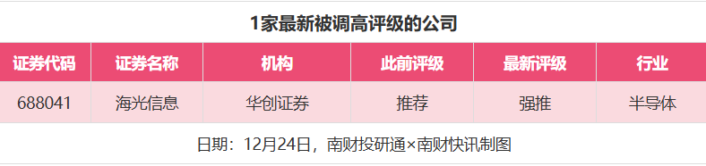 评级调高方面,12月24日,券商调高上市公司评级达到1家次,华创证券对海光信息的评级从“推荐”调高至“强推”。