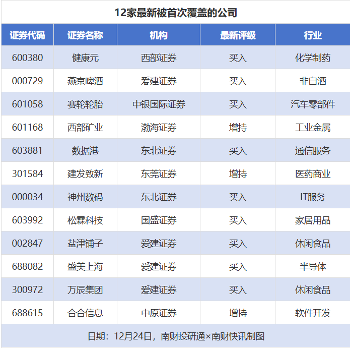 首次覆盖方面,12月24日券商共给出了12次首次覆盖,其中健康元获得西部证券给予“买入”评级,燕京啤酒获得爱建证券给予“买入”评级,赛轮轮胎获得中银国际证券给予“买入”评级,西部矿业获得渤海证券给予“增持”评级,数据港获得东北证券给予“买入”评级。