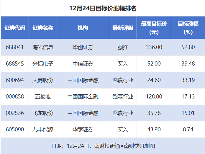 南财投研通数据显示,12月24日,券商给予上市公司目标价共6次,按最新收盘价计算,目标价涨幅排名居前的公司有海光信息、兴福电子、大商股份,目标价涨幅分别为52.80%、39.48%、33.19%,分别属于半导体、电子化学品、一般零售行业。