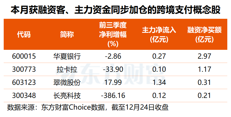资金方面,12月以来,共有15只跨境支付概念股获融资净买入,民生银行、四方精创等5股的融资净买额均在1亿元以上,电科网安、青岛银行均获融资客抢筹近6000万元。其中,翠微股份、华夏银行、长亮科技、拉卡拉4股同步获得主力资金青睐,主力净流入资金分别为1.34亿元、2685万元、1222万元和968万元。