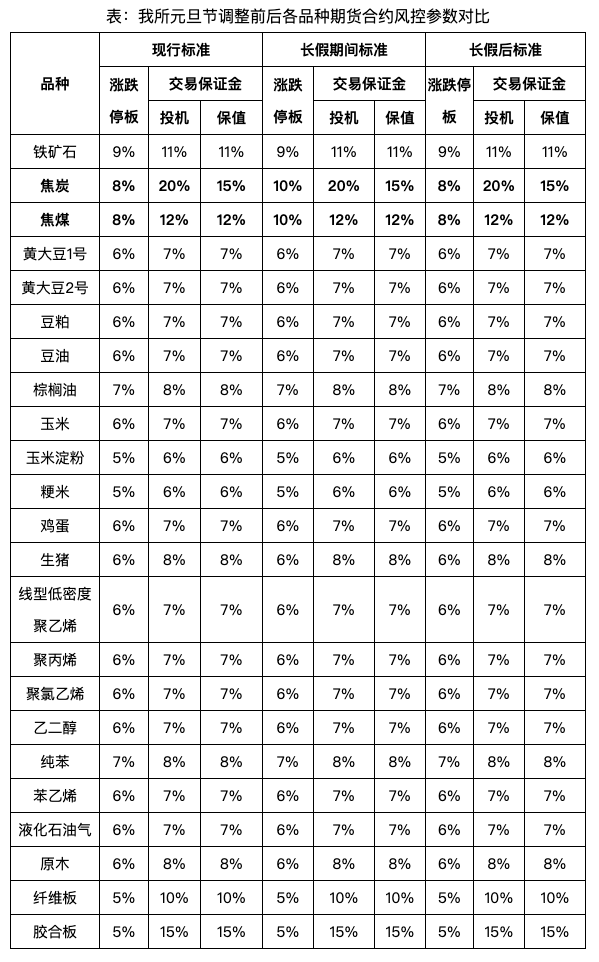 自2025年12月30日(星期二)结算时起,焦炭品种期货合约涨跌停板幅度调整为10%,交易保证金水平维持不变;焦煤品种期货合约涨跌停板幅度调整为10%,交易保证金水平维持不变;其他品种期货合约涨跌停板幅度和交易保证金水平维持不变。