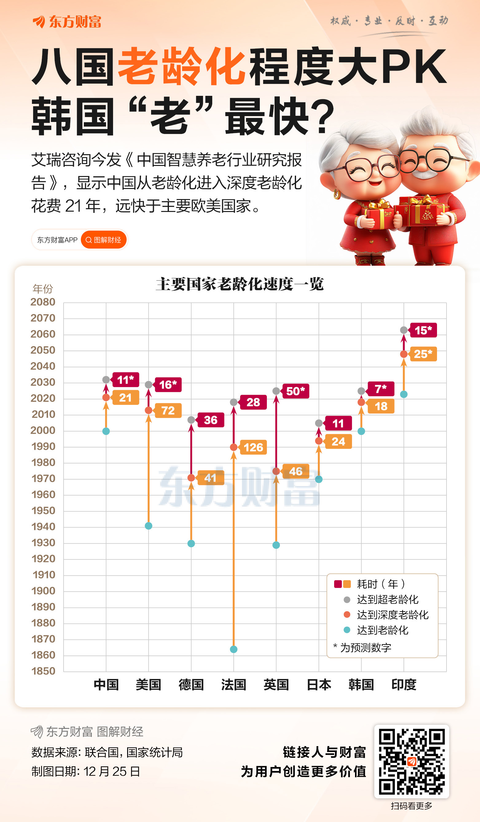 艾瑞咨询今日(12月25日)发布《中国智慧养老行业研究报告》,其援引的联合国相关数据显示,中国从老龄化进入深度老龄化花费21年,远快于主要欧美国家。根据联合国标准,65岁及以上人口占比达7%为老龄化社会,14%为深度老龄化,20%以上为超老龄化。官方数据显示,截至2024年末,中国65周岁及以上老年人口占总人口15.6%,绝对数量达到2.2亿人。