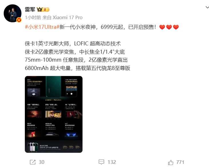 25日晚,小米创办人,董事长兼CEO雷军在微博发文称:“小米17Ultra新一代小米夜神,6999元起,已开启预售。徕卡1英寸光影大师,LOFIC 超高动态技术、徕卡2亿像素光学变焦,中长焦全1/1.4″大底、75mm-100mm 任意焦段,2亿像素光学直出、6800mAh 超大电量,搭载第五代骁龙8至尊版 。”