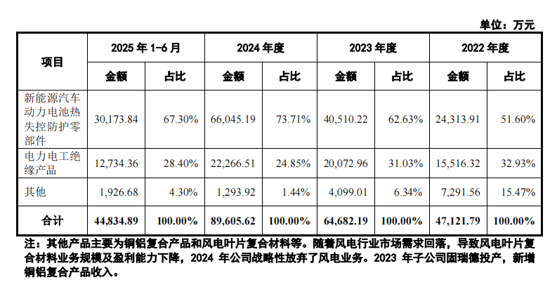 根据最新披露的数据,固德电材的主营业务正在发生重心位移。2022年至2024年,其新能源汽车动力电池热失控防护零部件收入分别为2.43亿元、4.05亿元和6.60亿元,占主营业务收入的比重由51.60%快速攀升至67.30%。与此同时,公司曾经的支柱业务——风电领域则处于收缩状态。