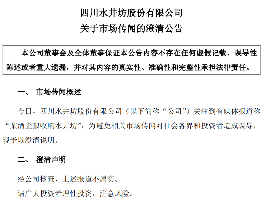 水井坊公告称,公司关注到有媒体报道称“某酒企拟收购水井坊”,为避免相关市场传闻对社会各界和投资者造成误导,现予以澄清说明。