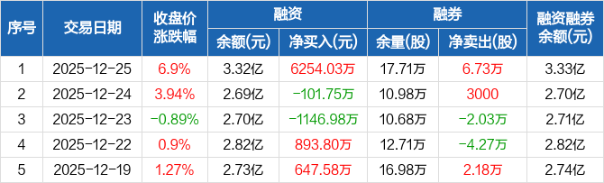 融资方面,当日融资买入9191.15万元,融资偿还2937.11万元,融资净买入6254.03万元,净买入额创历史新高。融券方面,融券卖出6.82万股,融券偿还900股,融券余量17.71万股,融券余额109.8万元。融资融券余额合计3.33亿元。