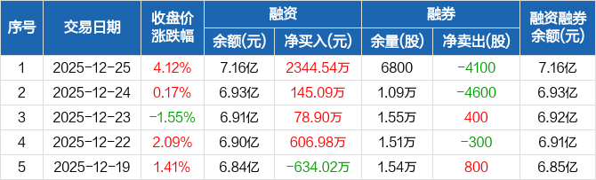 融资方面,当日融资买入7828.66万元,融资偿还5484.12万元,融资净买入2344.54万元,连续4日净买入累计3175.52万元。融券方面,融券卖出0股,融券偿还4100股,融券余量6800股,融券余额44.98万元。融资融券余额合计7.16亿元。