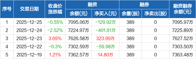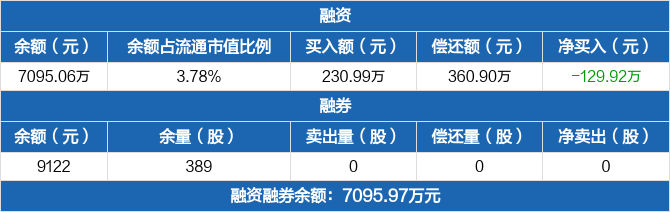 融资方面,当日融资买入230.99万元,融资偿还360.9万元,融资净偿还129.92万元。融券方面,融券卖出0股,融券偿还0股,融券余量389股,融券余额9122元。融资融券余额合计7095.97万元。