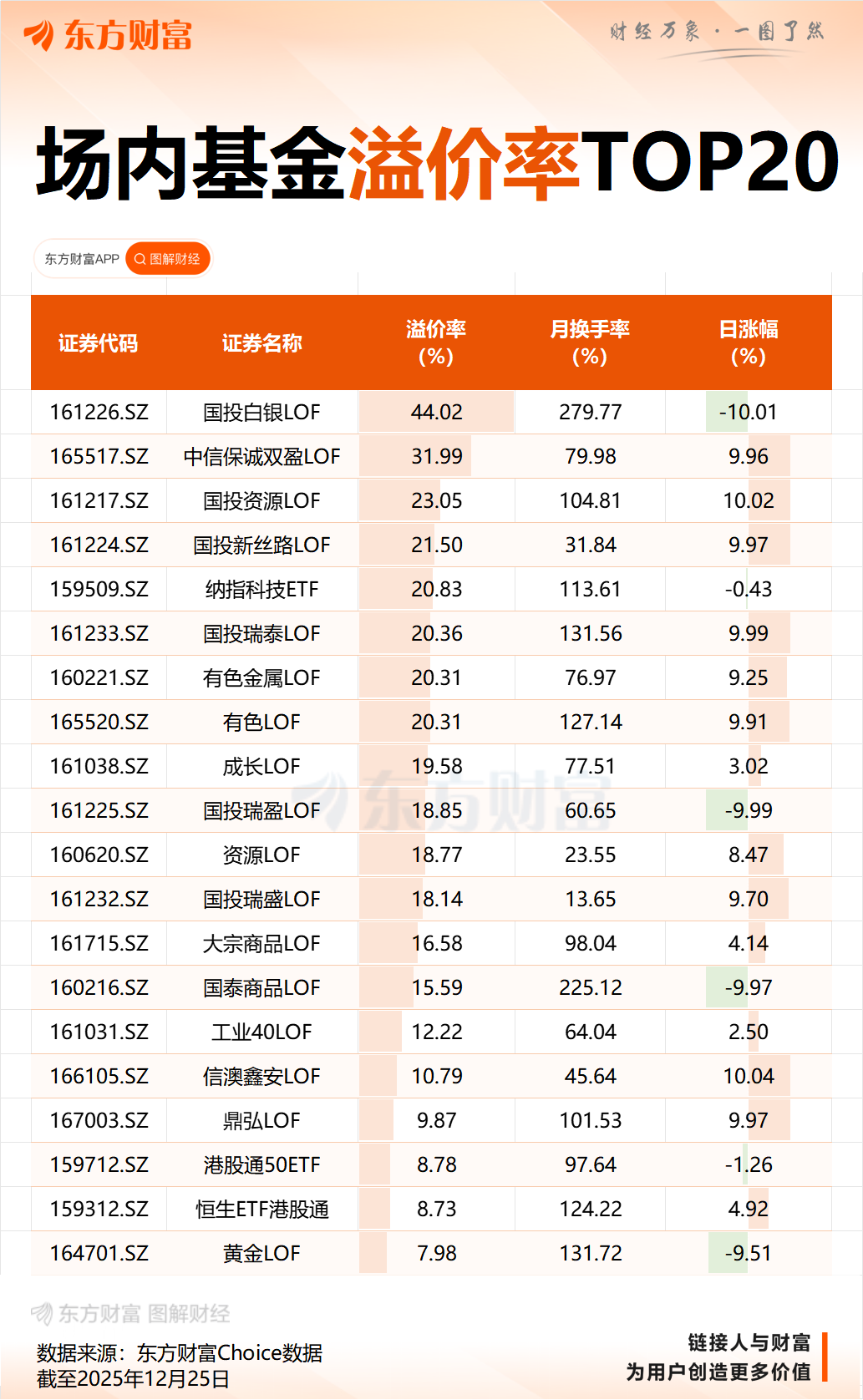 另外,国投白银LOF发布公告称,将于 26日开盘起至10:30停牌后复牌,并警示二级市场交易价格存在明显溢价风险 。截至12月25日,该基金二级市场收盘价为2.804元,较12月24日的基金份额单位净值1.9278元高出45%。