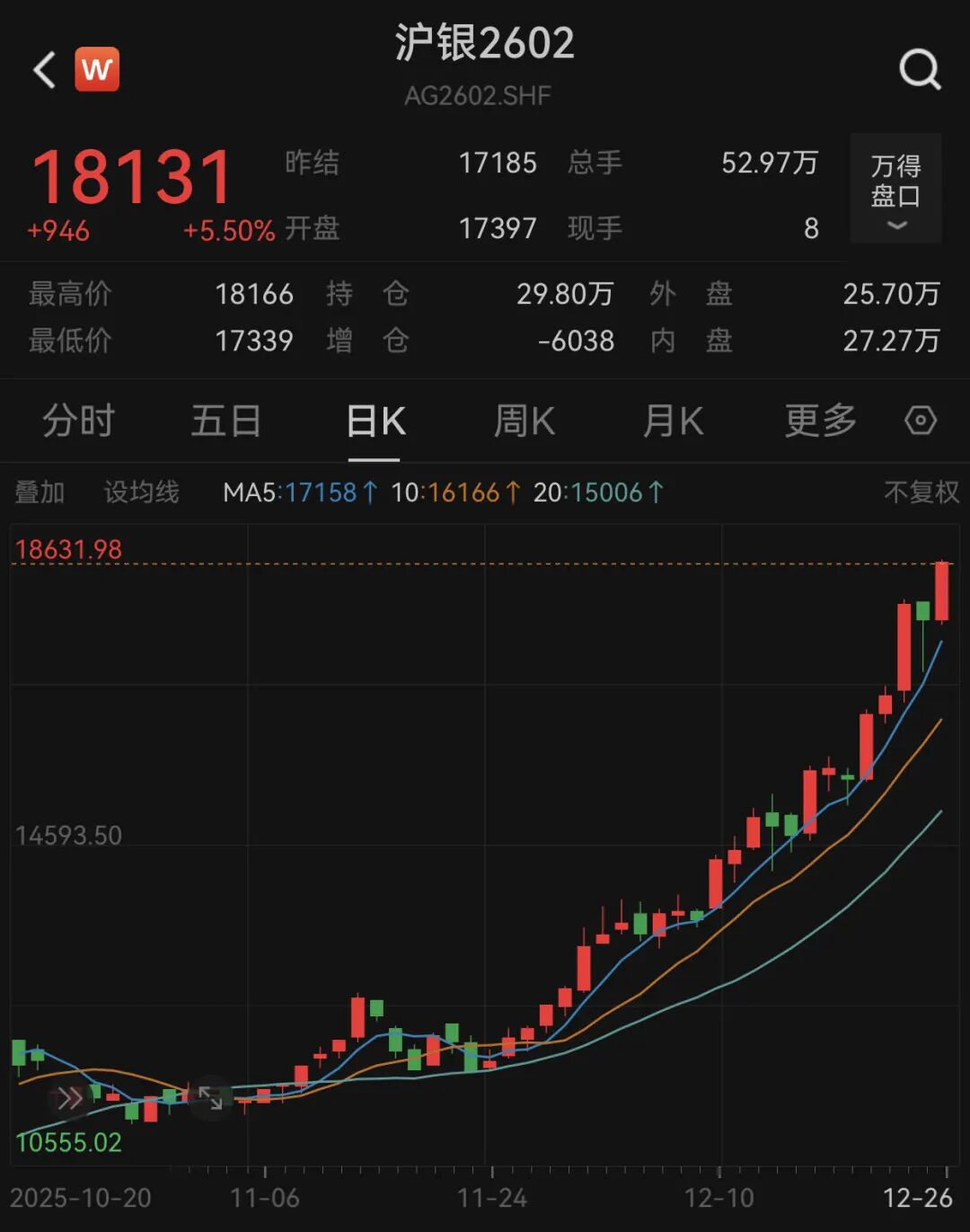 沪银夜盘暴涨5.5%,突破18000元/千克。