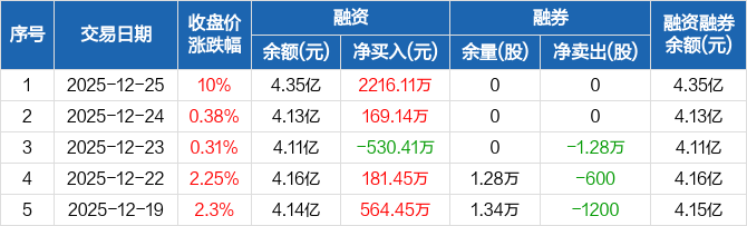 融资方面,当日融资买入6657.9万元,融资偿还4441.79万元,融资净买入2216.11万元。融券方面,融券卖出0股,融券偿还0股,融券余量0股,融券余额0元。融资融券余额合计4.35亿元。