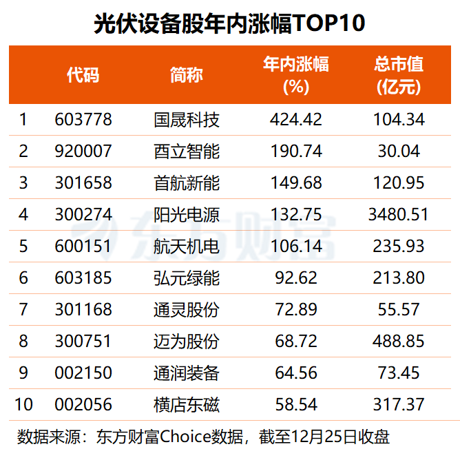 超七成光伏设备股年内股价上涨,平均涨幅约28.35%,其中,国晟科技、首航新能、阳光电源等5股股价已翻倍,横店东磁、德业股份、泽润新能等10股区间涨幅均在50%-100%之间。