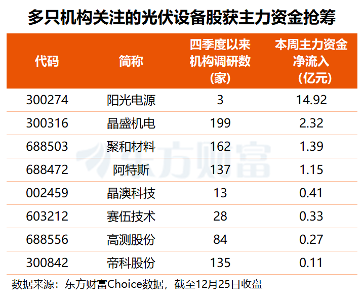 值得注意的是,上述28只机构关注的光伏设备股中,本周有11股获主力资金净流入,其中,阳光电源主力净流入资金高达14.92亿元,晶盛机电获主力资金加仓2.32亿元,聚和材料、阿特斯也获主力资金大举抢筹,净流入资金分别为1.39亿元和1.15亿元。
