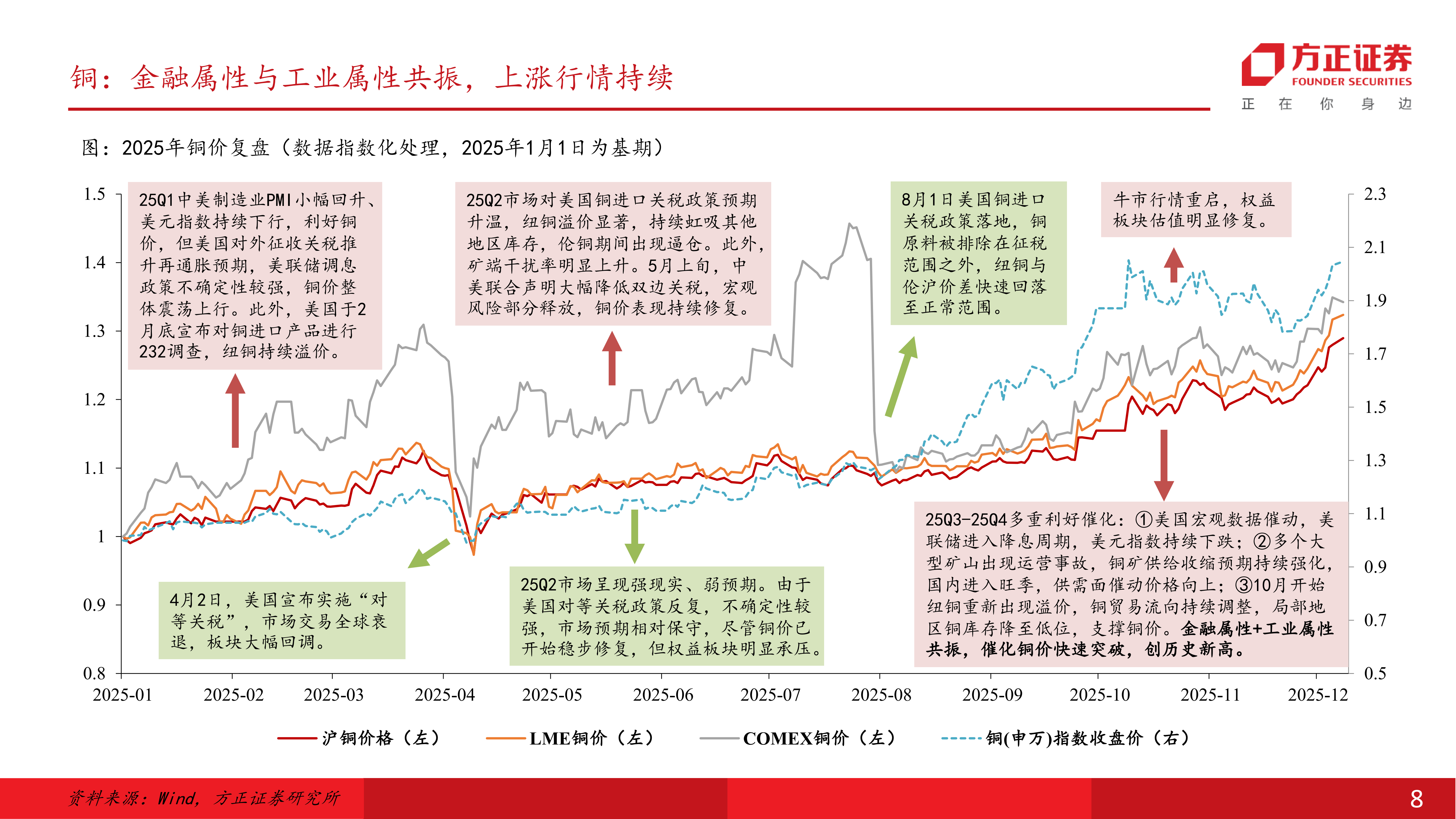 方正证券认为,2025年Q4-2026年Q1,铜矿供给短缺情况有望持续,2026年铜矿供给趋紧格局基本确定,预计2026年铜矿端增速约为0.9%,精炼铜供给增速约为1.3%,精炼铜需求增速约为2.2%,供需增速差值有望持续推升铜价上涨。