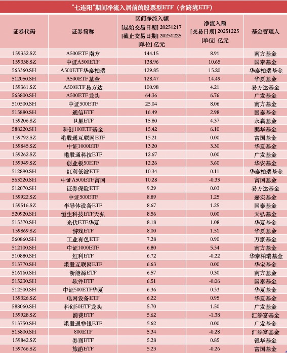 资金面上,股票型ETF呈现显著净流入。澎湃新闻记者根据Wind数据统计发现,12月25日,全市场1284只可统计的股票型ETF(含跨境ETF)合计净流入73.13亿元。将时间拉长至近七个交易日(12月17日至25日),股票型ETF整体净流入规模达733.23亿元。