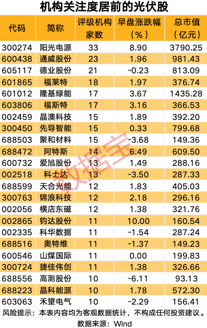 据证券时报·数据宝统计,A股中光伏产业链个股超过100家,其中48股获得5家及以上机构评级,约占总数的四成。阳光电源、通威股份、德业股份机构关注度居前,分别有33家、23家、21家机构评级。