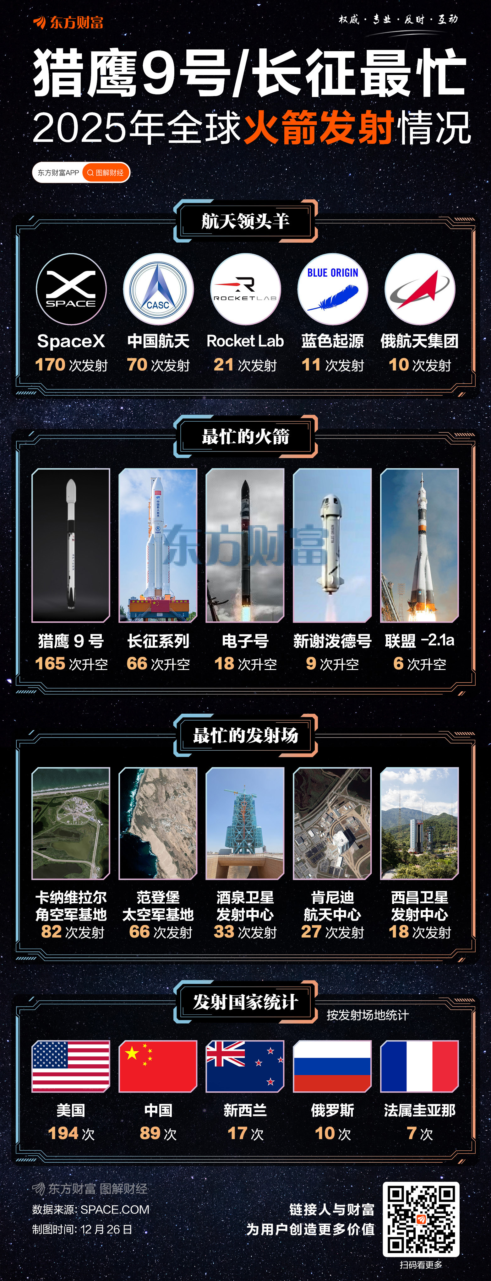 发射场来看,美国的卡纳维拉尔角空军基地最忙,年内承接了82次火箭发射。范登堡太空军基地紧随其后,年内承接66次火箭发射。酒泉卫星发射中心排在第三位,年内承接了33次火箭发射。肯尼迪航天中心,西昌卫星发射中心也是年内火箭升空较多的地方,分别为27次和18次。