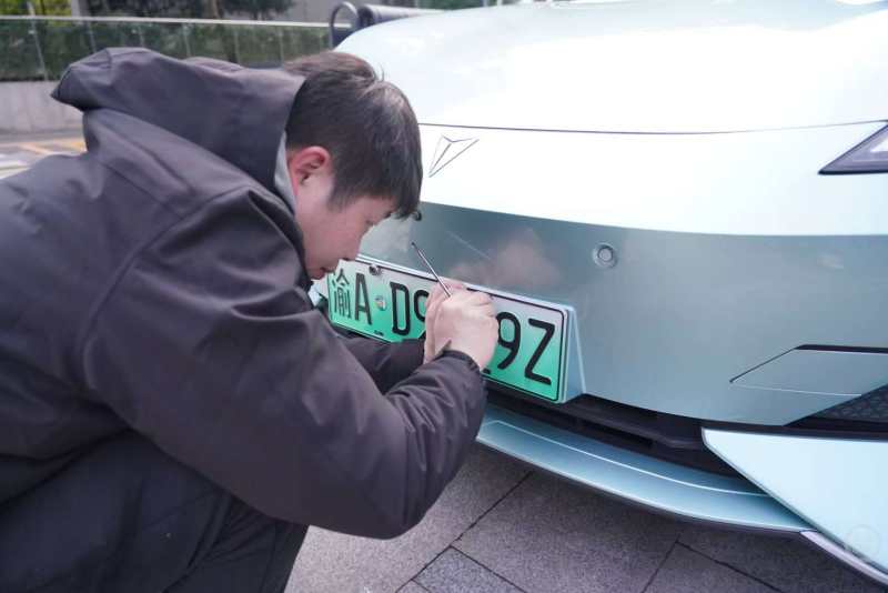 工作人员正在为车辆装上L3级自动驾驶专用正式号牌。
