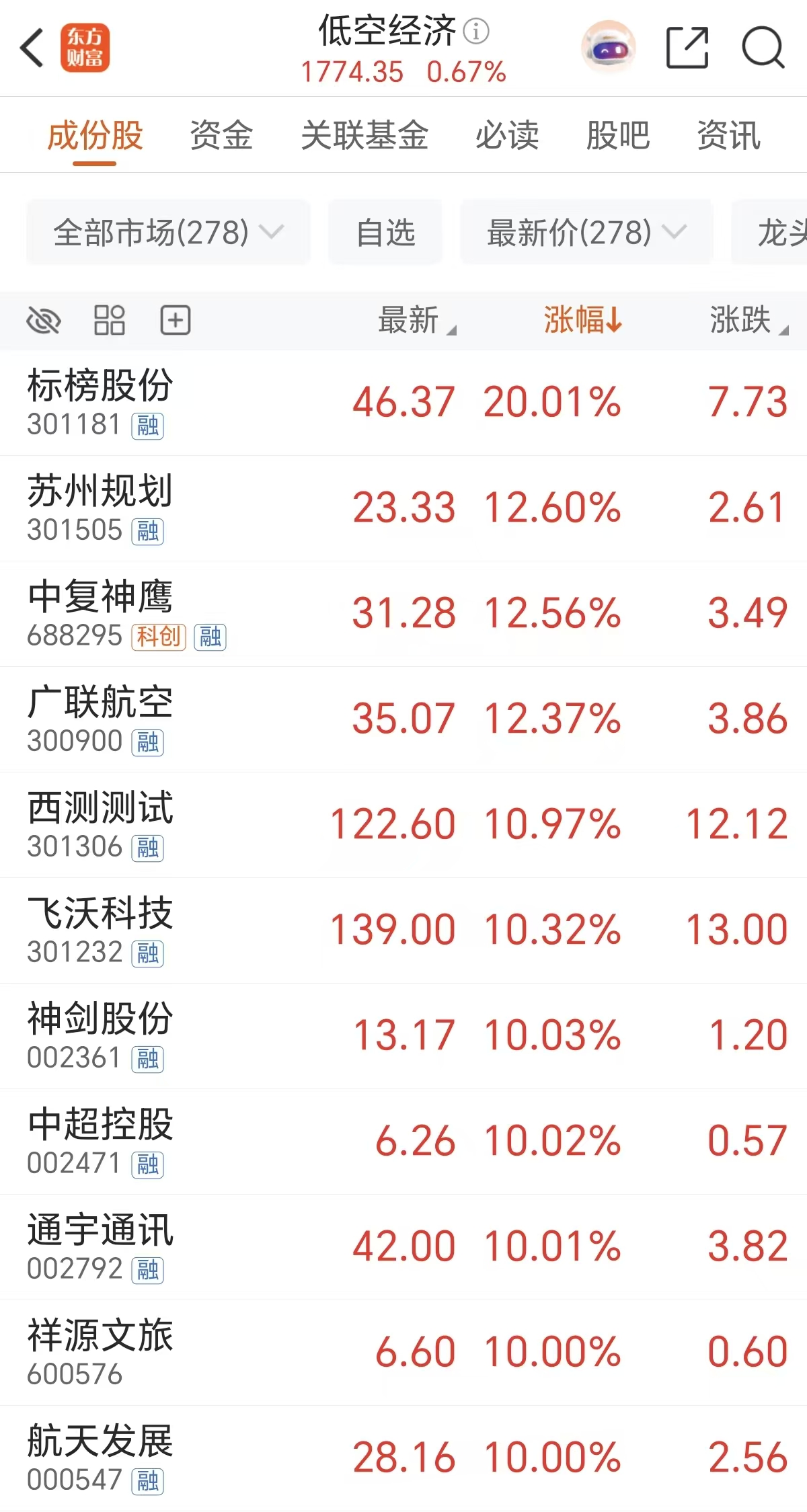 周五(12月26日)低空经济概念掀起涨停潮,标榜股份20CM涨停,中复神鹰、广联航空涨超12%,神剑股份、中超控股、通宇通讯、祥源文旅、航天发展等多股涨停。