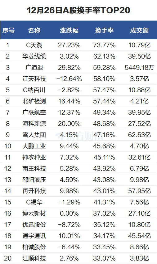 当天换手率最高的个股为C天溯,全天换手率73.77%。华菱线缆紧随其后,全天换手率62.13%。