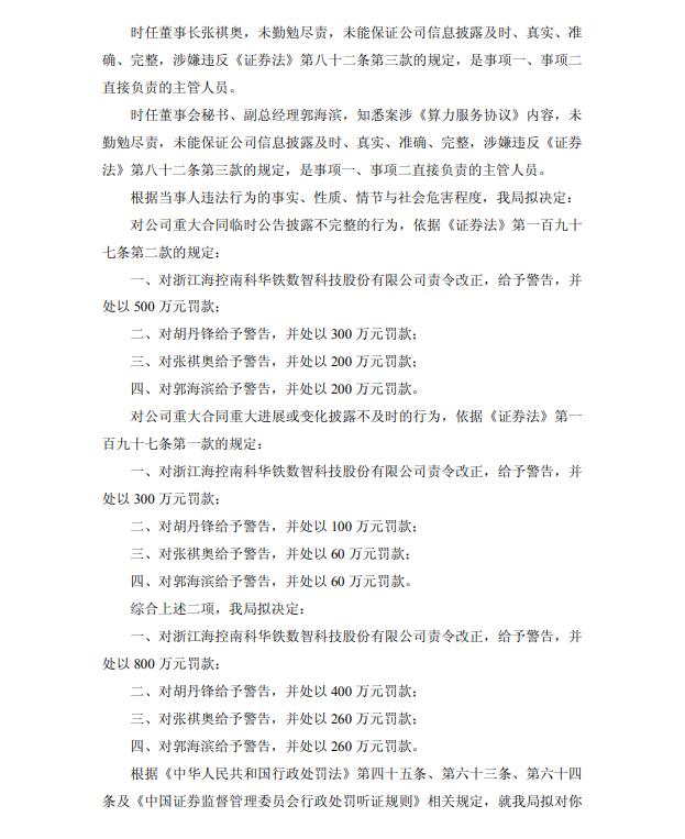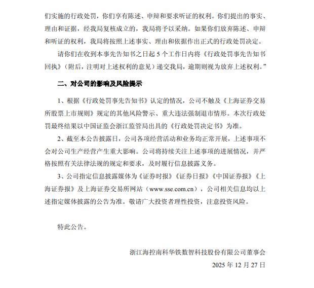 海南华铁(603300.SH)公告称,公司收到中国证监会浙江监管局下发的《行政处罚事先告知书》。经查明,公司重大合同临时公告披露不完整,未披露对协议履行有重大影响的条款;重大合同重大进展或变化披露不及时。公司拟被责令改正,给予警告,并处以800万元罚款。此外,公司时任总经理、董事胡丹锋,时任董事长张祺奥,时任董事会秘书、副总经理郭海滨也拟被处以罚款。公司表示,不触及其他风险警示、重大违法强制退市情形,目前经营活动和业务均正常开展。